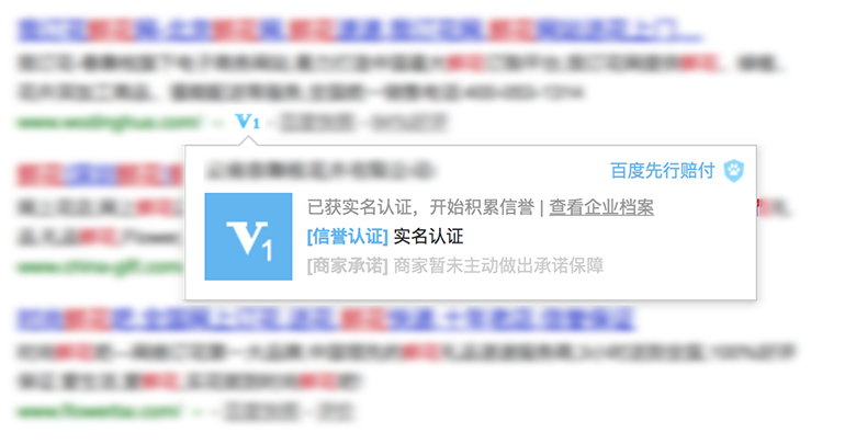 認證成功的企業將獲得百度商家信譽評級,擁有量身定制信譽檔案,并在百度搜索結果展示藍色V標。
