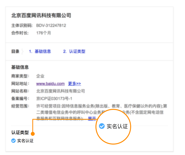 實名實網認證是對網站經營主體的身份真實性進行核實,并結合營業執照、法人身份證、組織機構代證、ICP備案、銀行對公賬戶等多種手段,確保網站經營及管理主體的身份合法存在,核驗通過的信息會進行公開展示,以便于在消費者決策時,提供信息參考。